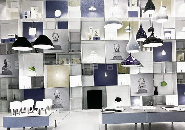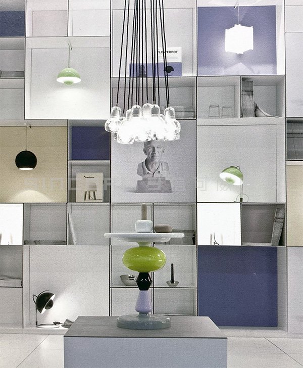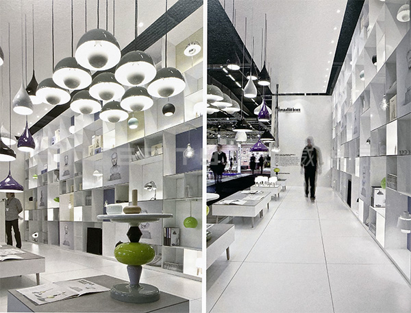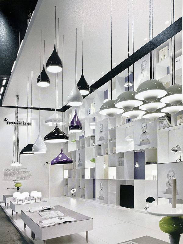 本項目是傳統公司在斯德哥爾摩家具展上的丹麥&tradition的燈具展臺設計。相比較而言,此展廳長而窄,很明顯只能在垂直方向上做文章。眾多格子頗有韻律地堆砌在一起,顯得俏皮而嚴肅,這正符合品牌的定位。展廳前后的顏色與&傳統的商標一致,公司設計師的大理石半身像被印成圖片掛在前面。展品與多維度的貨架完美地結合在一起,給人一種比例扭曲的感覺。形態各異的吊燈自天花板垂下,一起構成一襲透明的窗簾。