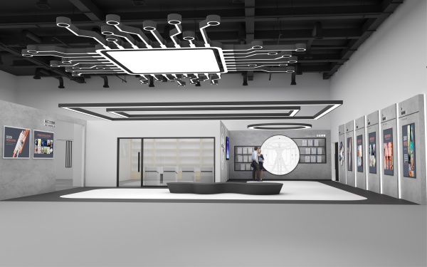 每個(gè)空間的輻射半徑是有限的,那如何在有限的空間中展現(xiàn)出主題的內(nèi)容,我們需要找尋在空間的視覺中心,并且在視覺中心中衍生交互展示的概念拓展。這次我們收到的委托命題,基于企業(yè)需求,我們決定用藍(lán)色來闡述這個(gè)空間。用顏色來闡述企業(yè)的辨識度,以簡約的設(shè)計(jì)體塊去表達(dá)空間為企業(yè)展廳賦予全新的生命力。